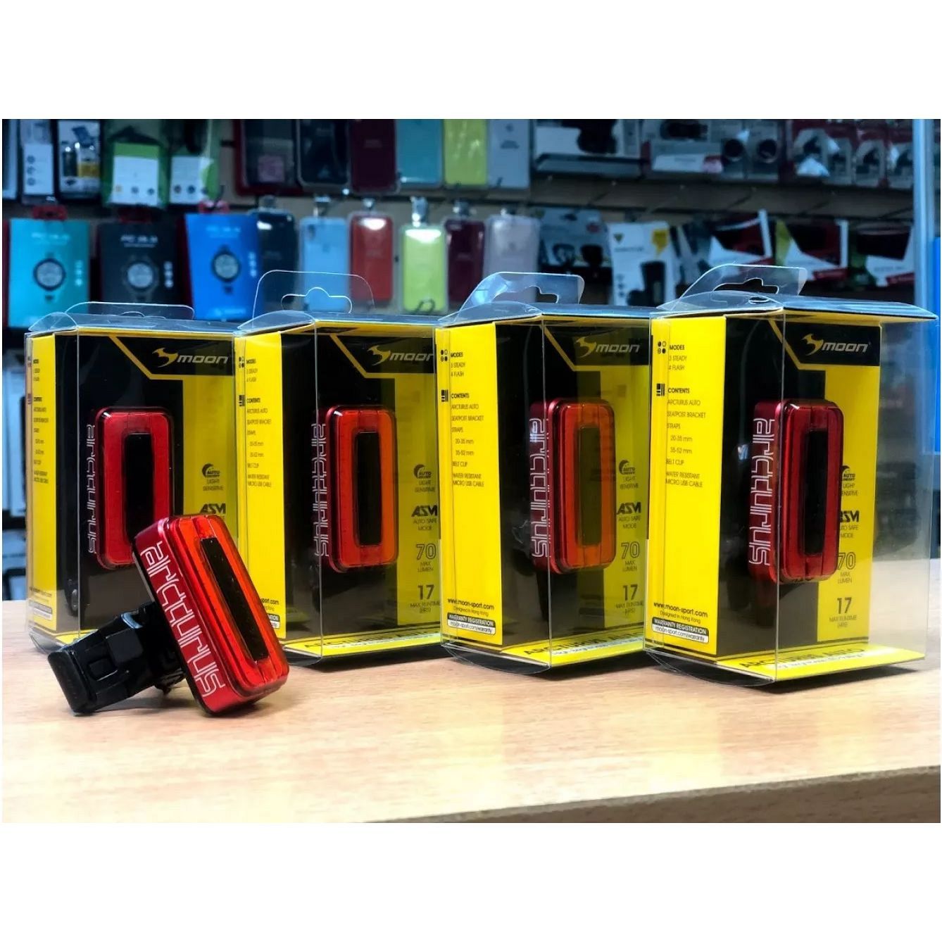 Moon Arcturus Auto – задний велосипедный фонарь изготовлен из алюминиевого сплава с хорошим отводом тепла. Модель обладает индикатором разряда и зарядки и имеет функцию автоматического отключения при полной зарядке. 2 типа креплений позволяют монтировать фонарь на практически любую часть велосипеда, а так же на велошлем. Устройство имеет функцию автоматического включения и выключения для экономии заряда аккумулятора при остановке велосипеда. 7 режимов работы. Литий-полимерный аккумулятор 300 mah. Время автономной работы до 17 часов. Влагозащищённый корпус IPX 4. Вес 30 г.