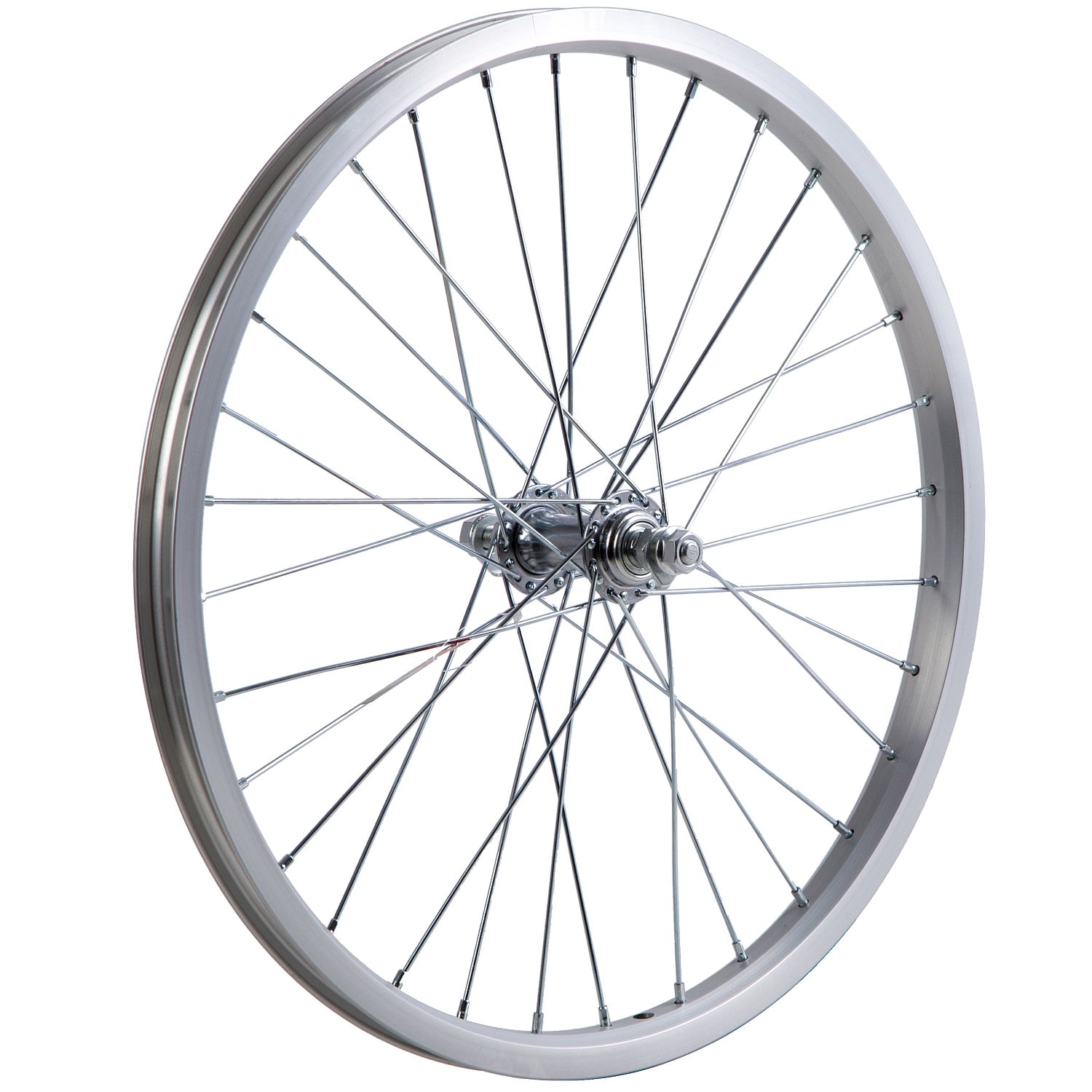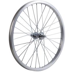 Колесо переднеебез резины. Диаметр - 20. Одинарный алюминиевый обод. 32 спицы, втулка сталь. Ось на гайках.