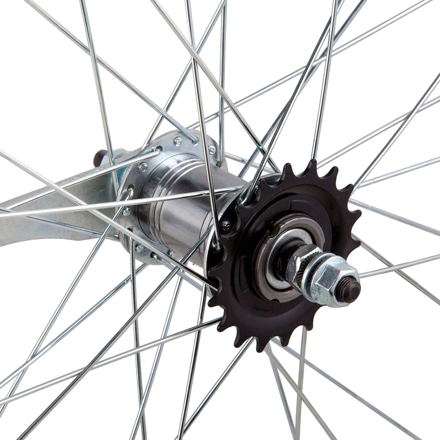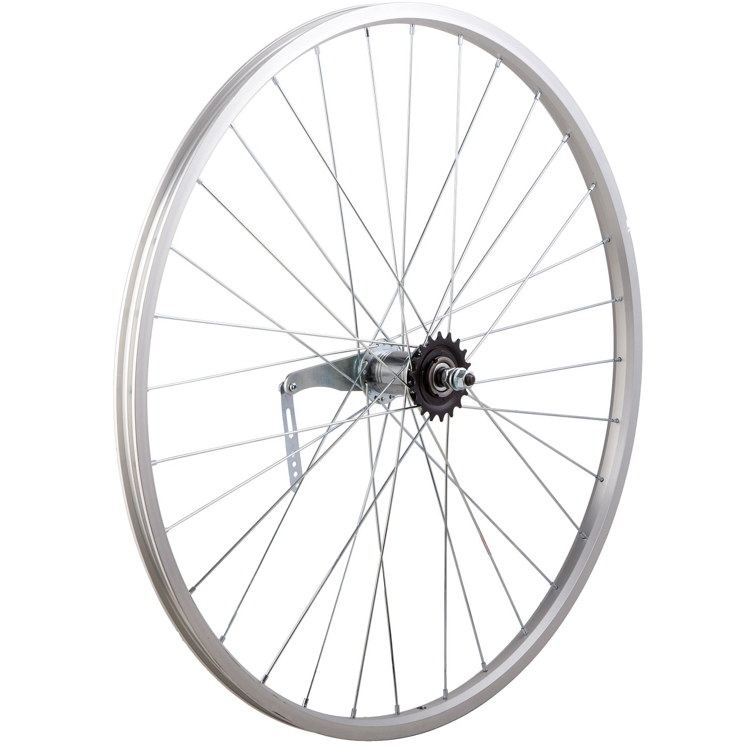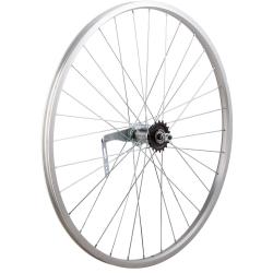Колесо 28 заднеебез резины. Одностенный алюминиевый обод на 32 спицы. Тормозная втулка сталь, ось на гайках.