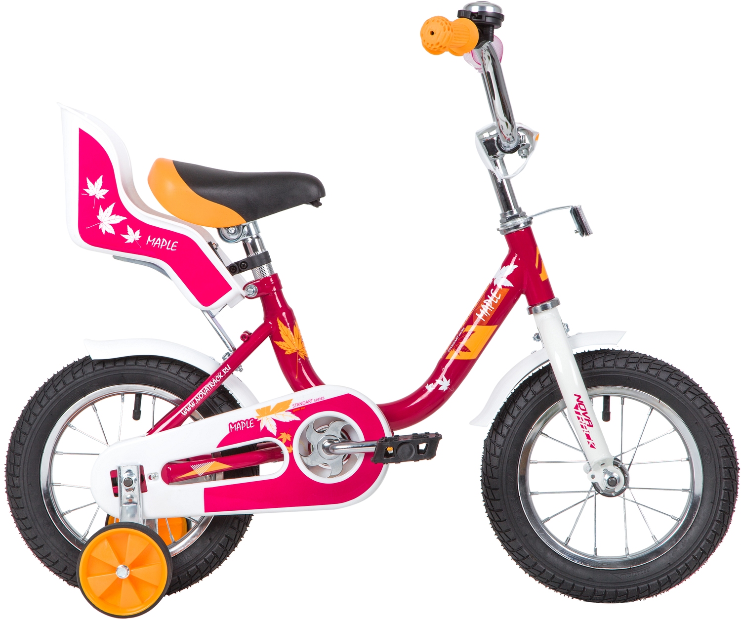Novatrack Maple 12 - модель относится к серии велосипедов для девочек. Удобная низкая рама, регулировка седла и руля по высоте - все это сделает обучение катания на велосипеде простым и удобным. Отличительная особенность этой модели - сидение для куклы, ведь как можно не взять с собой подругу на велопрогулку.