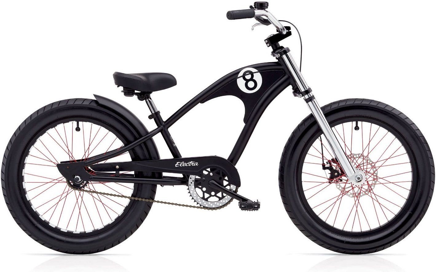 Electra Straight 8 1-speed 20" – это детский велосипед, который выглядит невероятно круто и стильно, словно уменьшенная копия взрослой модели. Вдохновленный мотостилистикой знаменитых американских хот-родов, этот велосипед привлекает внимание своим черным цветом, красными спицами, шахматным ободом на задней шине и кастомными колпачками на ниппель в виде бильярдного шара 8.