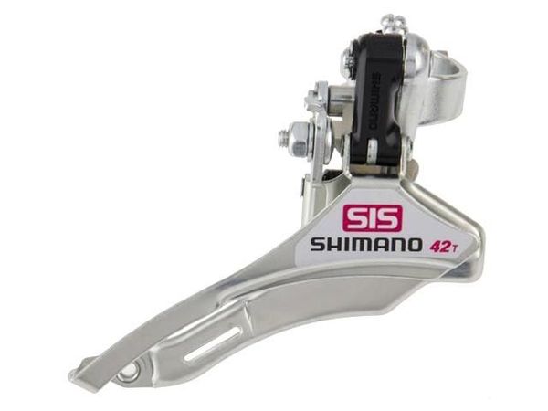 Переключатель передний Shimano TY10. Нижняя тяга. Диаметр хомута - 31.8 мм. Максимальное количество зубьев на звезде - 42T.