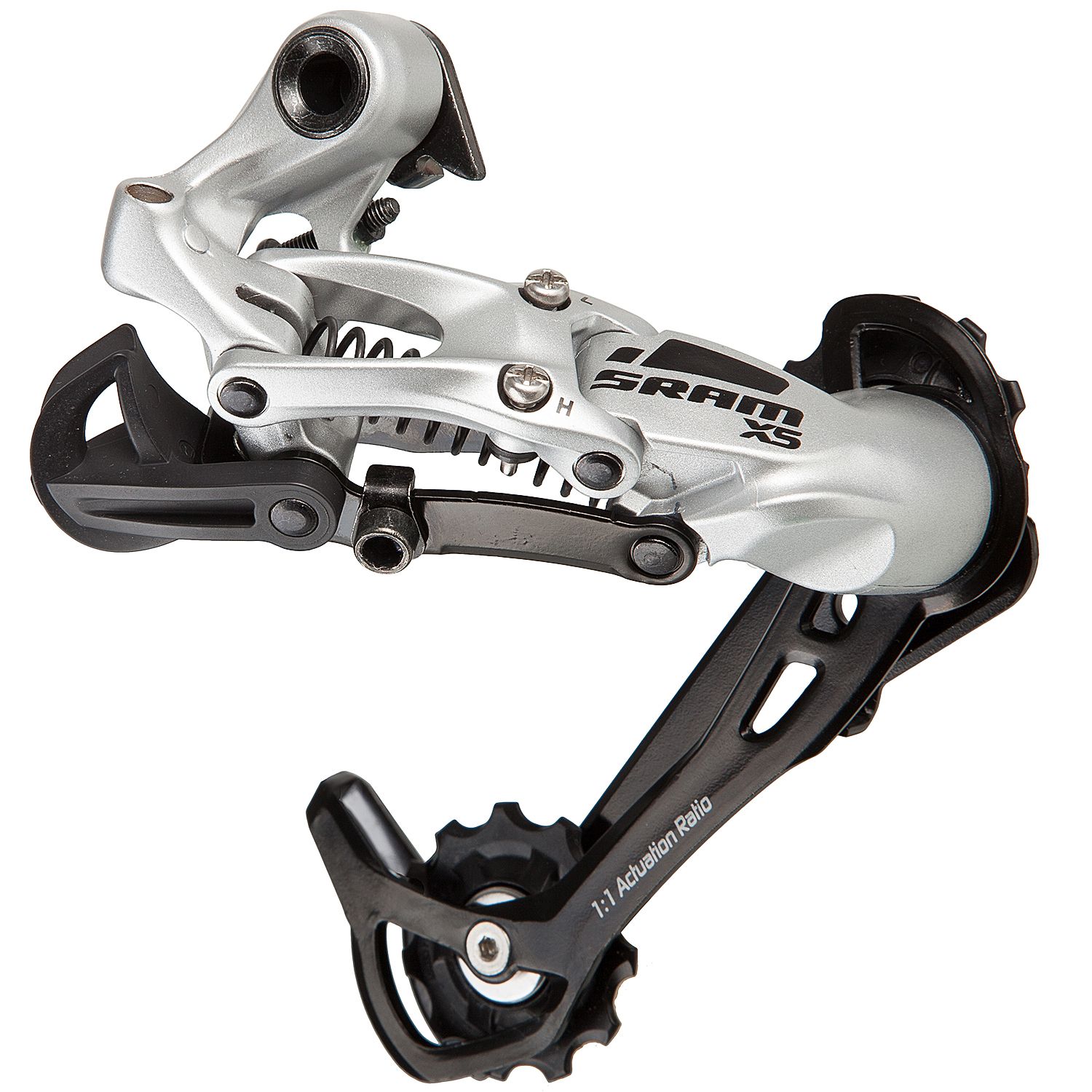 Задний переключатель любительского уровня SRAM X5 на 8-9 скоростей. Технология Direct Route обеспечивает прямую подводку троса, благодаря чему повышается точность переключения.