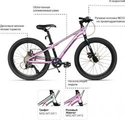 Велосипед оснащён 24-дюймовыми колесами и 8-скоростной трансмиссией с задним переключателем Shimano Acera, что гарантирует плавное и надежное переключение передач. Дисковые механические тормоза отвечают за высокую эффективность торможения, а алюминиевые двойные обода и втулки на промподшипниках способствуют долговечности и надёжности конструкции.