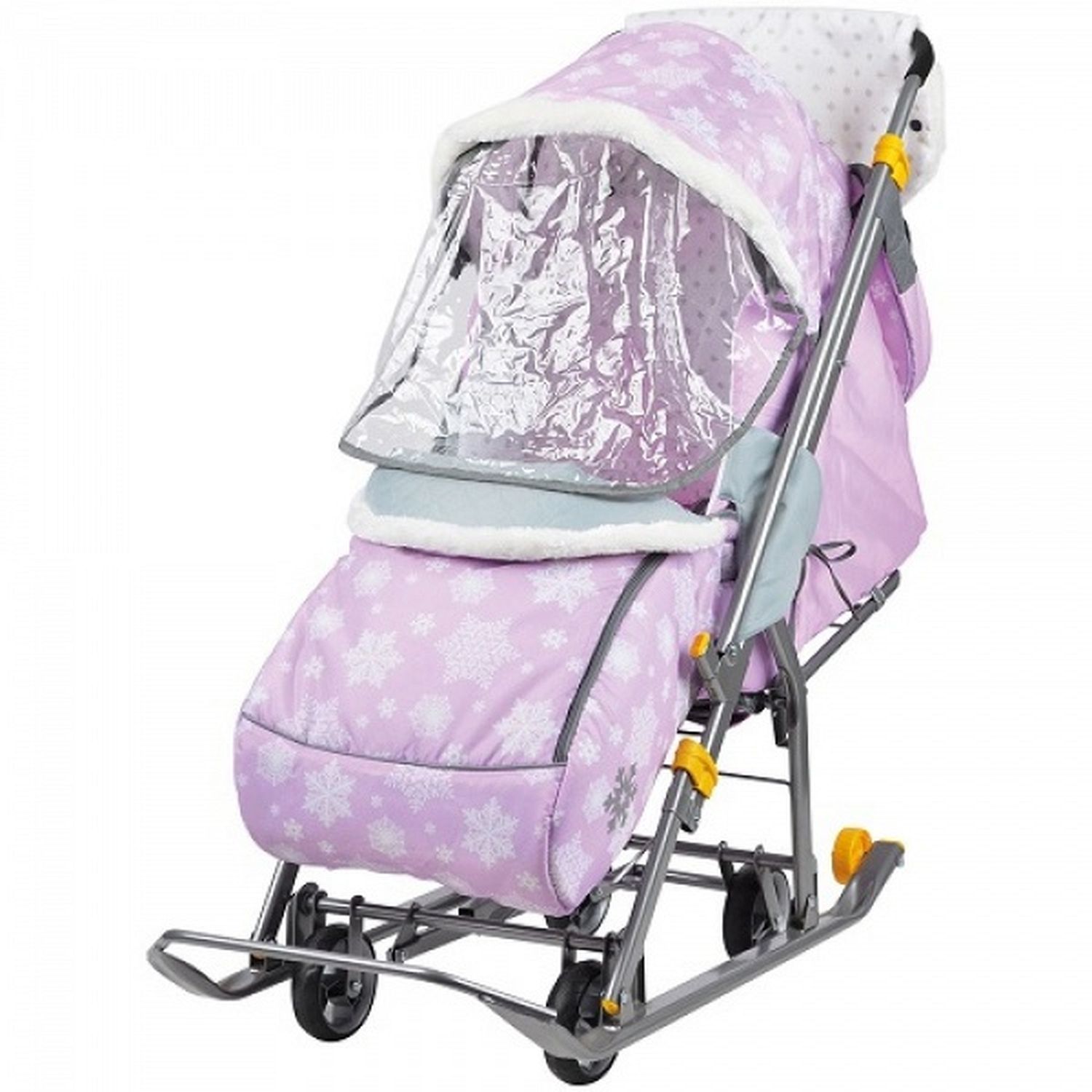 Коляска комбинированная с трансформируемым кузовом позволяет передвигаться по любой дороге. Нажатием ноги на педаль опускаются колеса, и вы можете везти коляску по асфальту или по гладкому полу. Еще одно нажатие — коляска трансформируется в санки и снова скользить по снегу!