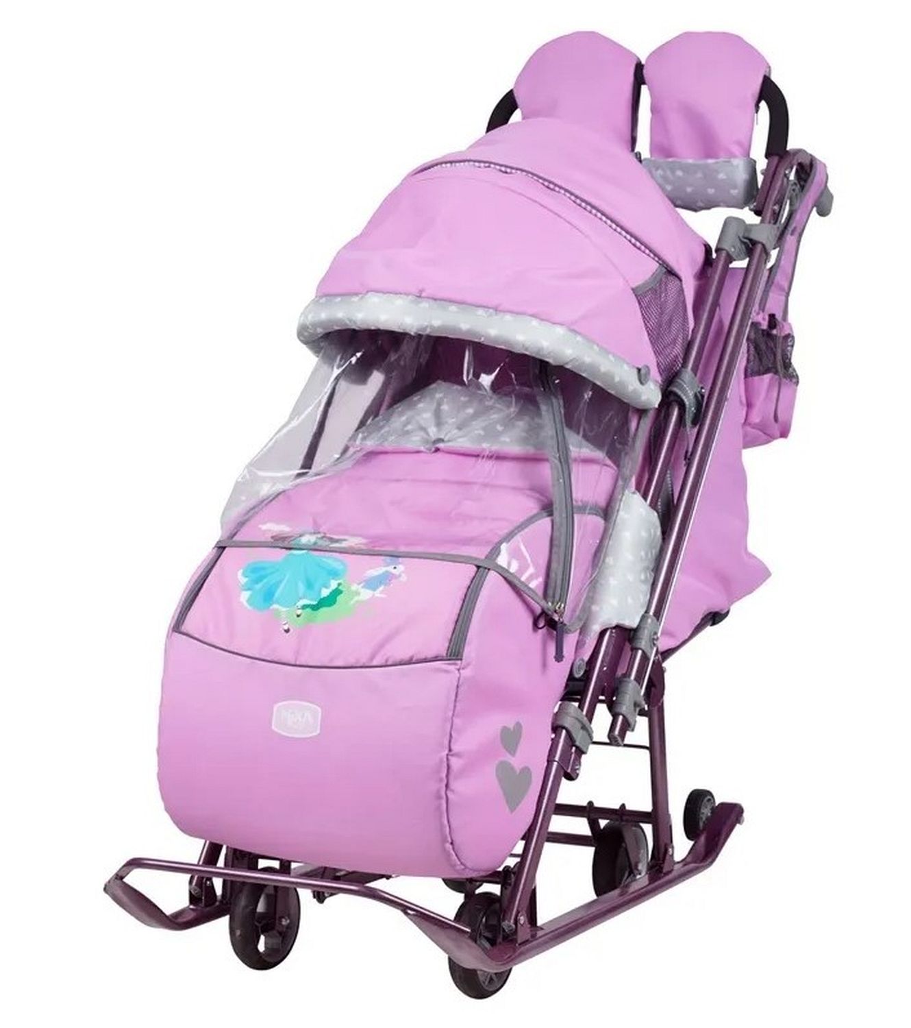 Коляска комбинированная с трансформируемым кузовом позволяет передвигаться по любой дороге. Нажатием ноги на педаль опускаются колеса, и вы можете везти коляску по асфальту или по гладкому полу. Еще одно нажатие — коляска трансформируется в санки и снова скользить по снегу!