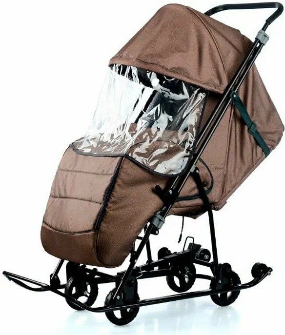 Санки-коляска со складным механизмом и выдвижной колесной базой. Оснащены перекидной ручкой с прорезиненной накладкой. Плоские полозья 30х15 мм. Колёса (127 мм.) с мягкими шинами из ЭВА. Пластиковые колеса (6 мм.) на полозьях для удобной транспортировки по твёрдому покрытию. Складной двухсекционный козырек (без смотрового окошка). Ветрозащитное стекло (750х320 мм.) на молнии. 2 положения регулировки спинки (сидя/полулёжа) с помощью фиксатора регулировочного ремня. Съёмный утеплённый чехол для ног с 2-мя молниями. Трёхточечный ремень безопасности. Модель без матрасика. Складная подставка для ног. Светоотражающий кант. Максимальная нагрузка 25 кг.