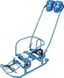 Эти санки оснащены металлическим каркасом с антикоррозийным покрытием, что гарантирует долговечность и устойчивость к внешним воздействиям. Механизм выдвижных колёсных шасси позволяет легко переключаться между режимами скольжения по снегу и передвижения по твёрдым поверхностям. Плоские полозья способствуют плавному и стабильному скольжению.