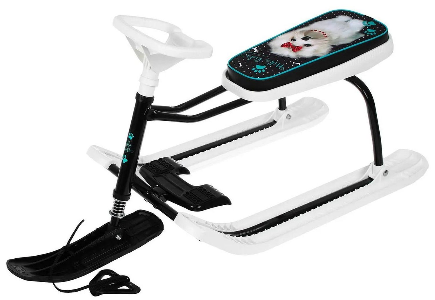 Спортивную модель снегоката оценят и дети, и взрослые. Это и отличный вариант для семейного досуга. Практичные снегокаты от российского производителя придутся по душе любому ребенку. Они имеют прочный металлический каркас, удобное сиденье и классическое расположение полозьев. Ребенок может управлять движением снегоката при помощи руля, который направляет ведущую переднюю лыжу. Также имеется прочная веревка с удобной пластиковой ручкой, при помощи которой снегокат легко перемещать. Снегокат имеет мягкое сиденье с принтом.