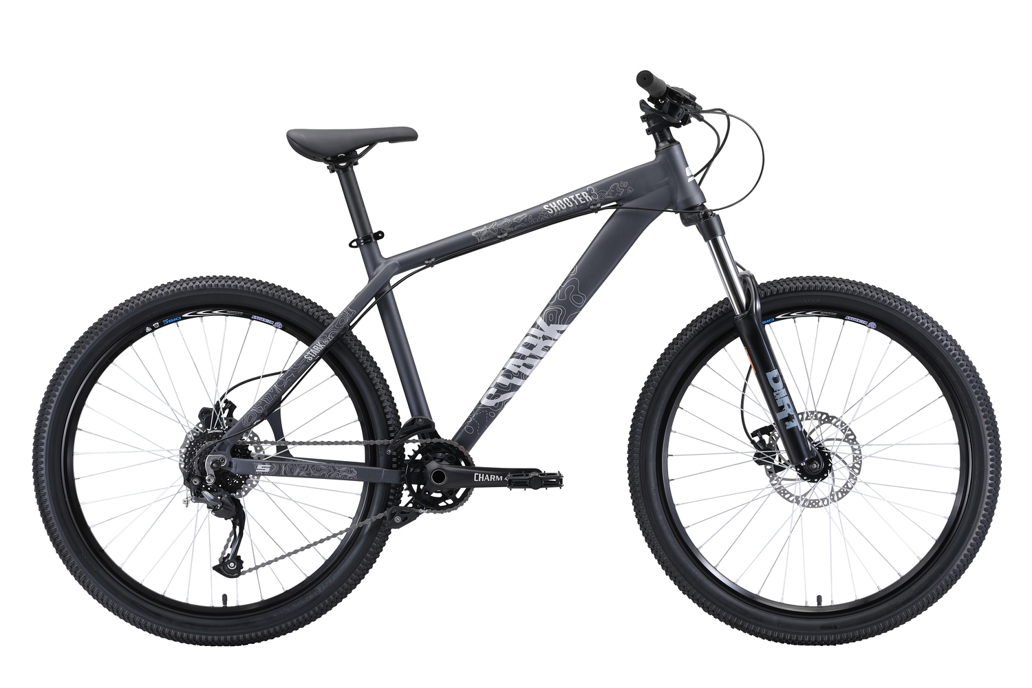 Stark Shooter-3 - экстремальный велосипеда с оборудованием любительского класса от известного бренда Shimano на 9 скоростей. Модель оснащена пружинно-масляной вилкой с ходом 130мм и дисковыми гидравлическими тормозами.