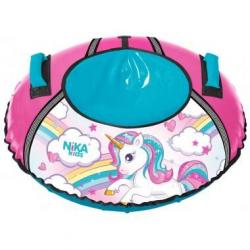 Тюбинг с мерцающими блестками и с рисунком единорога изготовлен из прочного тента, который устойчив к морозам до 28 градусов, все швы усилены капроновой лентой.